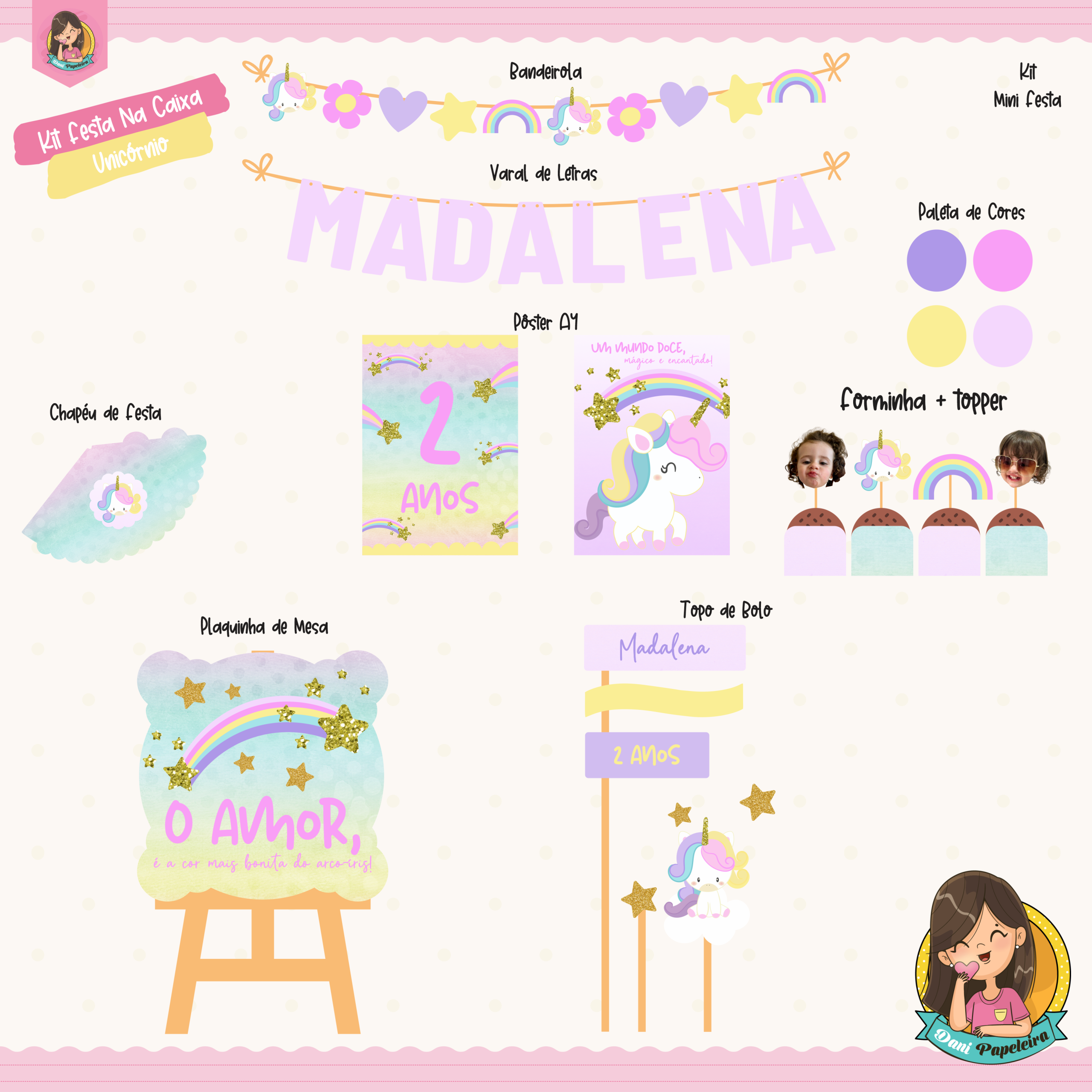Você recebe um kit completo, cuidadosamente produzido para deixar o momento ainda mais especial, prático e inesquecível. Cada item é pensado com carinho, no estilo fofinho que já é marca registrada da Dani Papeleira 💖✨