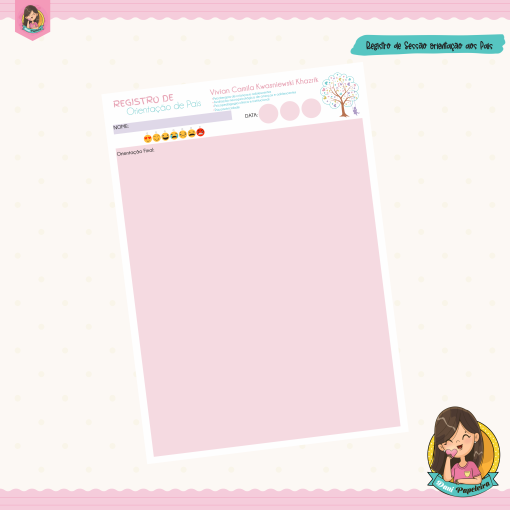 O Registro de Sessão Atendimento dos Pais foi desenvolvido para facilitar o acompanhamento de reuniões e atendimentos realizados com pais ou responsáveis. Psicólogos, psicopedagogos, terapeutas, coordenadores pedagógicos e equipes escolares encontram neste material uma solução prática para documentar orientações, demandas e encaminhamentos.